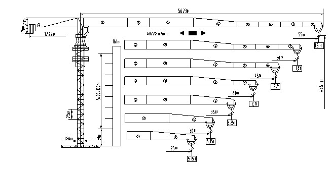 4) 適合于對幅度變化有要求的施工場合。此塔機臂節特殊的連接方式及沒有塔頭、拉桿,使其吊臂的逐節拆裝非常簡易、安全,施工中如需要改變吊臂的長度不用拆下整個吊臂,而在空中就可以文成臂節的增減。