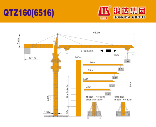 QTZ160(6516).10噸塔式起重機是滿足GB/T5031<<塔式起重機>>和GB5144<<塔式起重機安全規(guī)程>>等標準設(shè)計的加強型塔式起重機,額定起重力矩160t·m ,最大起重量為10噸,有 TC6516、TC6020、TC5525、TC5032、TC4537等類型。